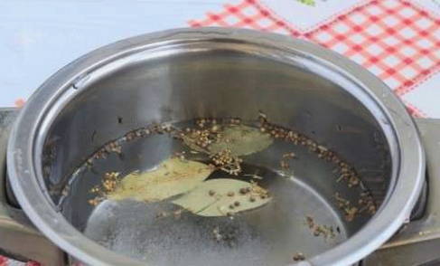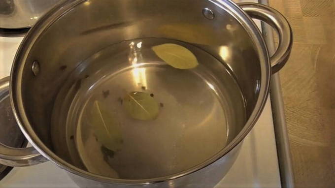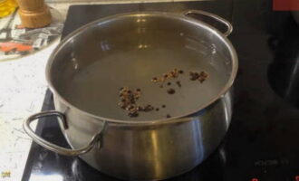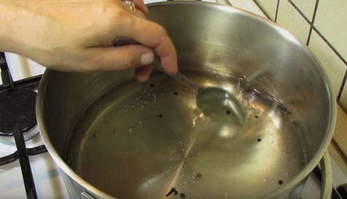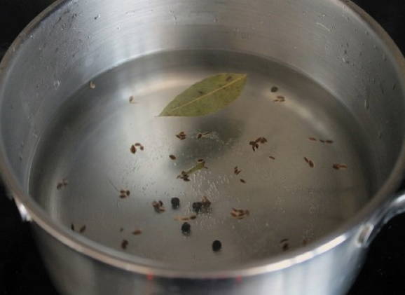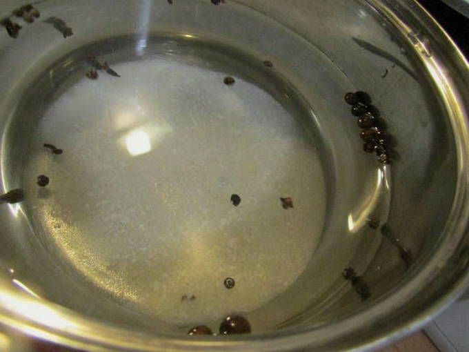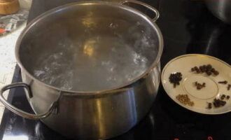 De volgende stap is het toevoegen van aromatische kruiden: kruidnagel, koriander en een paar erwten zwarte piment. Kook de pekel ongeveer 5-10 minuten.