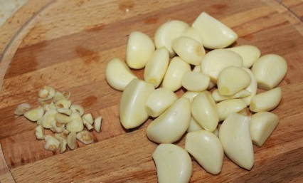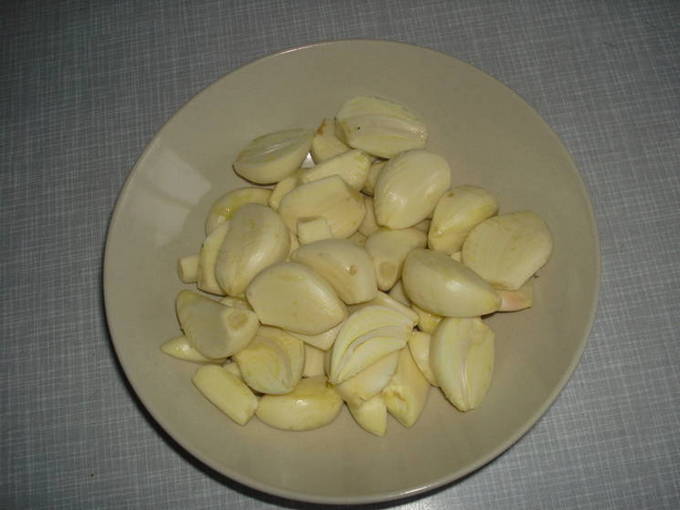 - Laten we beginnen met de knoflook. We spoelen de koppen grondig af onder stromend water, pellen ze af en verdelen ze in tanden.
