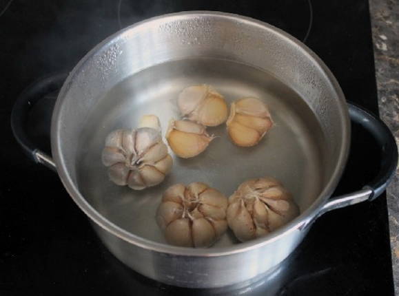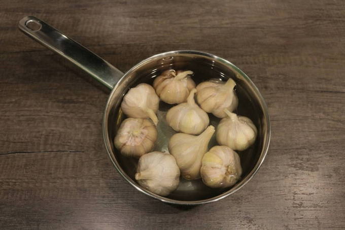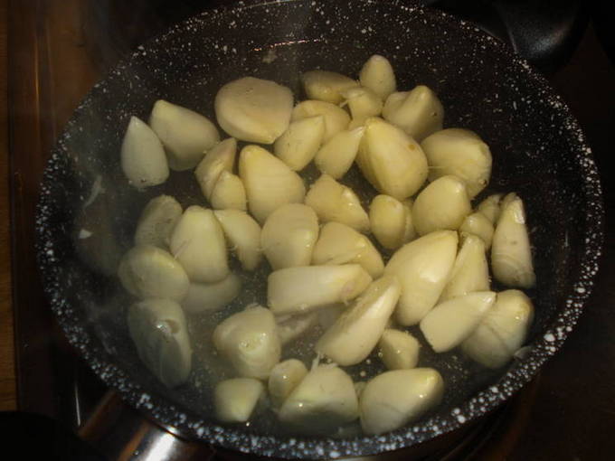 - Gepelde knoflook, grondig afspoelen onder stromend water en ongeveer 3 minuten in kokend water koken. Daarna plaatsen we de koppen in ijswater voor de snelst mogelijke koeling.