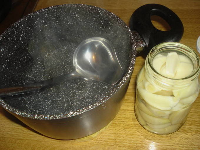 - Koel de resulterende pekel en giet er potten knoflook mee.