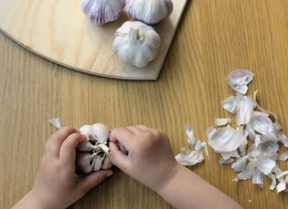 - Schil en spoel de koppen van jonge knoflook.