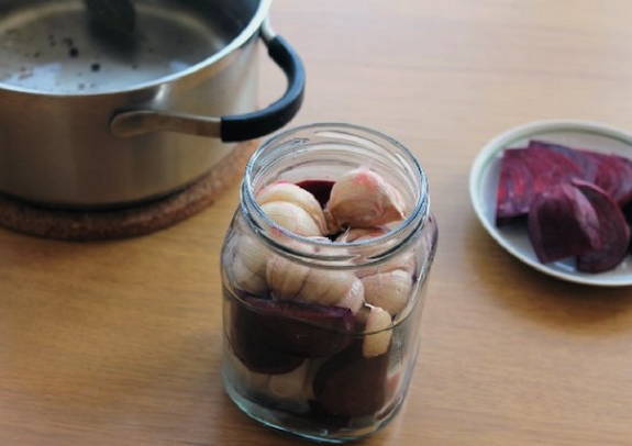 - Doe de plakjes biet en de knoflookbolletjes in een voorgesteriliseerde pot.