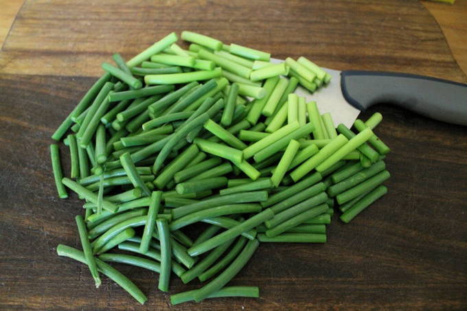 - Bereid de pijlen voor - spoel de stelen grondig af en laat alleen de felgroene stengels achter. Zorg ervoor dat u het zaadgedeelte afsnijdt en snijd elke stengel in reepjes van ongeveer 5 centimeter lang.