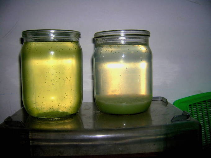 - Een week later vervangen we het sap door de marinade, die we in de koelkast hebben bewaard.