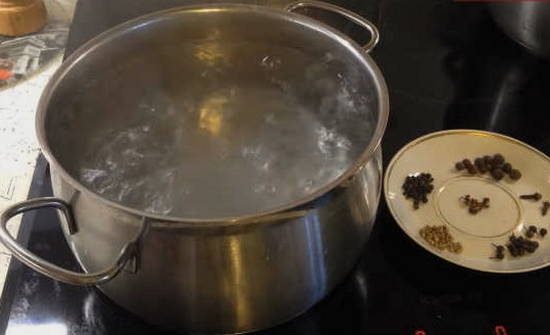 De volgende stap is het toevoegen van aromatische kruiden: kruidnagel, koriander en een paar erwten zwarte piment. Kook de pekel ongeveer 5-10 minuten.