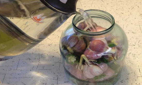 - Koel de resulterende pekel en giet er potten knoflook mee.
