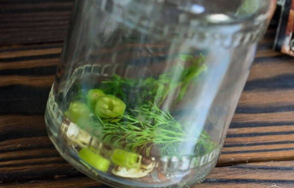 - We wassen en verbranden een glazen pot, doen er kruiden in: verse dille, chilipepers, knoflook, zwarte peperkorrels, kruidnagel en kaneel. Snijd grote ingrediënten in kleine stukjes.