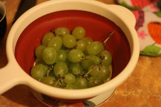 - We wassen de druiven van klein vuil en doen ze in een vergiet zodat het glas overtollig water krijgt.