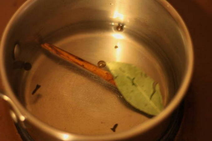 - Bereid de marinade voor in een pan. We koken water samen met suiker, zout, laurierblaadjes, kaneel en kruidnagel.Droogvoer moet volledig oplossen. Roer hiervoor de massa regelmatig om.