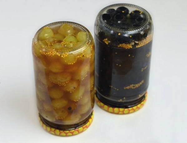 - Vul de producten in de pot met de bereide marinade. We sluiten de blanco's onmiddellijk af met deksels en laten ze volledig afkoelen. Ingelegde druiven met knoflook zijn klaar, opsturen voor opslag!