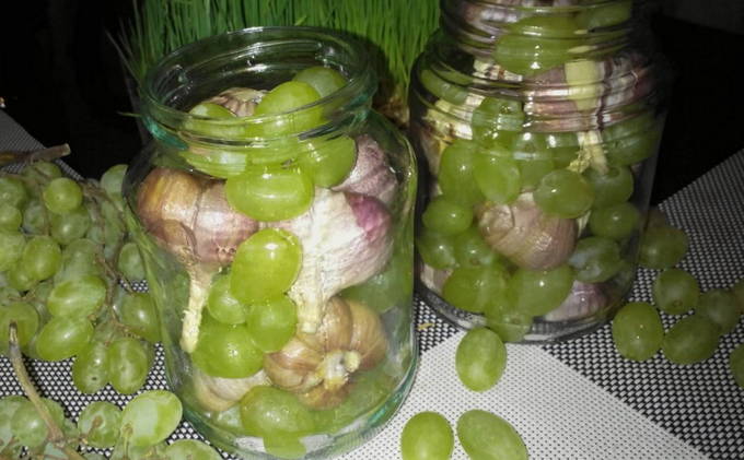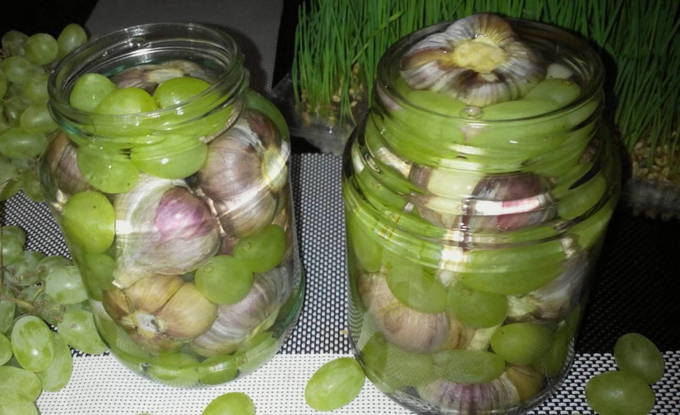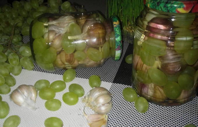 Je kunt druiven marineren in potten met kroppen knoflook. Dit maakt de zelfgemaakte bereidingen nog helderder en geuriger. Beide producten kunnen worden gebruikt. Serveer als koude snack of gebruik in andere gerechten.