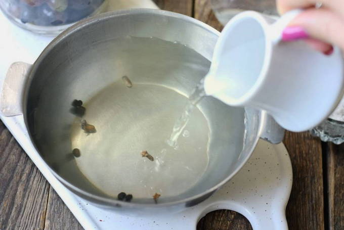 - Bereid de marinade voor in een pan. We koken water samen met suiker, zout, laurierblaadjes, kaneel en kruidnagel.Droogvoer moet volledig oplossen. Roer hiervoor de massa regelmatig om.