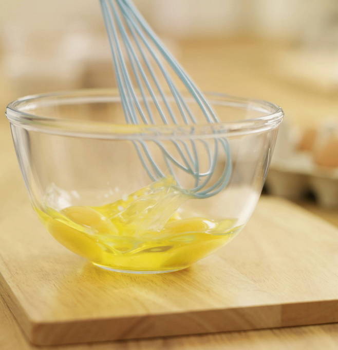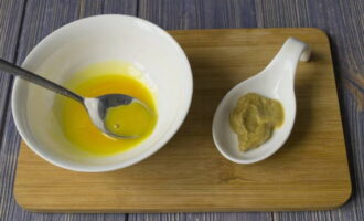 - Klop in een kom een vers ei los met de juiste hoeveelheid mosterd.