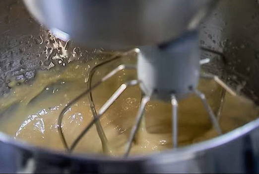 - Voeg geleidelijk boter toe aan de massa in zeer kleine porties, zonder het kloppen te stoppen, zodat de massa dik wordt en een intensere kleur krijgt.