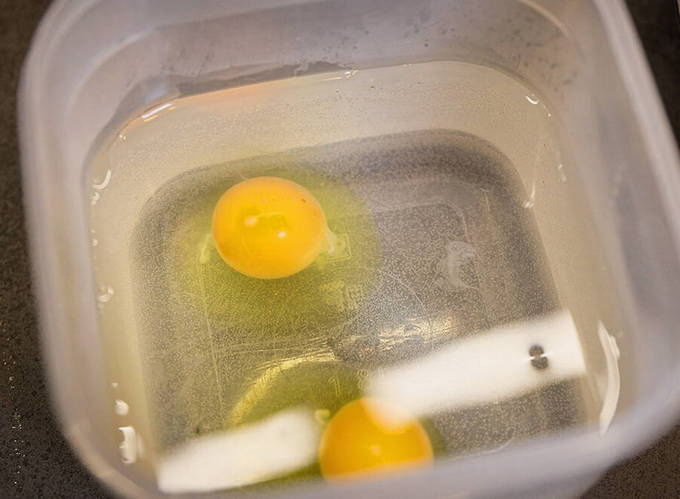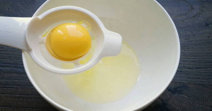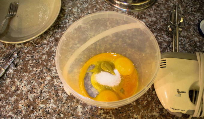 - Alle gebruikte producten moeten eerst in een warme ruimte staan voordat ze worden gekookt, zodat ze niet koud worden. Doe twee verse dooiers in een grote kom.
