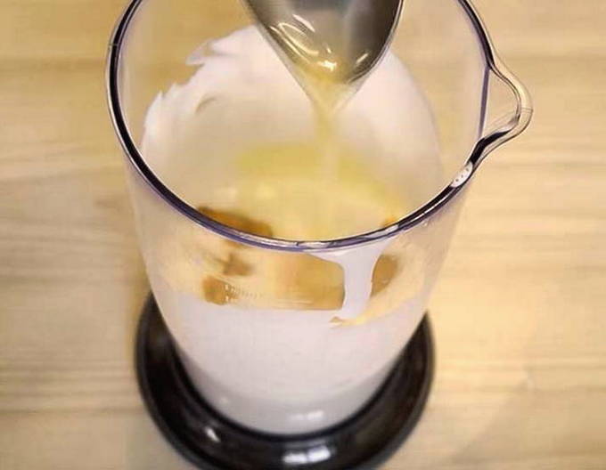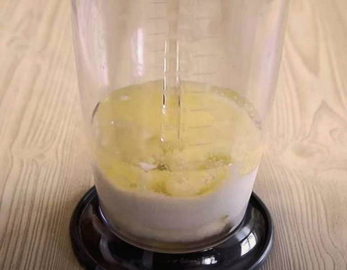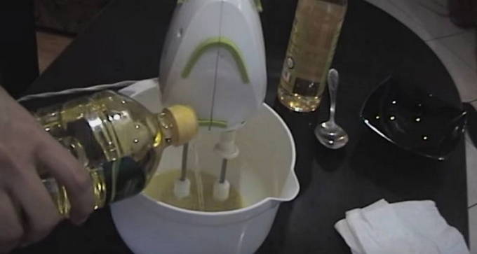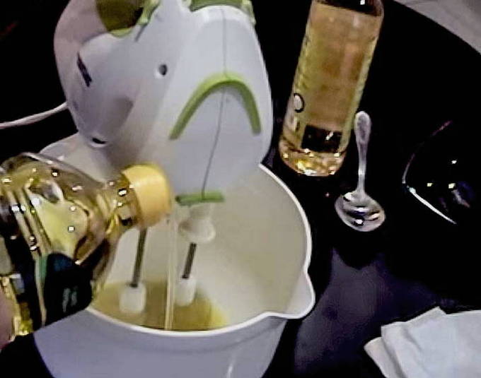 - Voeg olie toe aan het mengsel met een theelepel en klop de massa constant zodat deze de consistentie en dichtheid krijgt die kenmerkend is voor mayonaise.