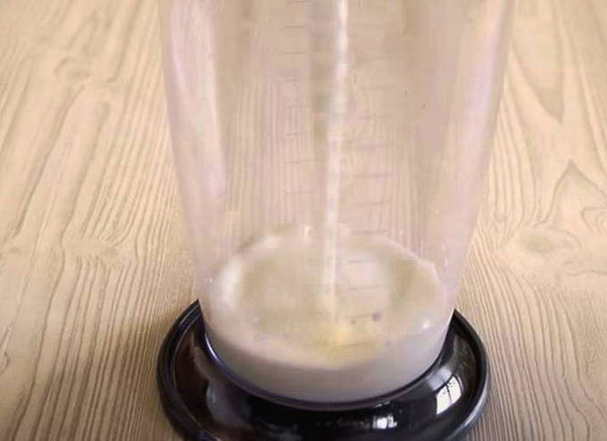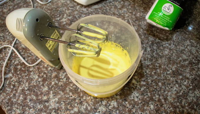 - We plaatsen een garde in een container en beginnen eerst met lage snelheid en vervolgens met zeer hoge snelheid te kloppen. Klop een paar minuten heel krachtig, totdat de massa dikker wordt en van kleur verandert.