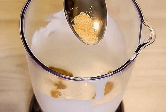 - Zoute melk, voeg de benodigde hoeveelheid suiker en mosterd toe, klop het mengsel.