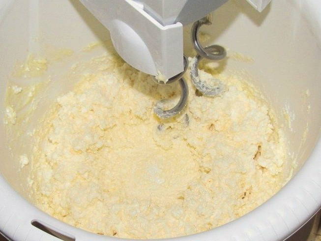 - Voeg geleidelijk, voorzichtig en in kleine porties boter toe aan de massa, constant roerend, zodat het mengsel onmiddellijk vermengt en dichter wordt en de structuur uniform wordt.