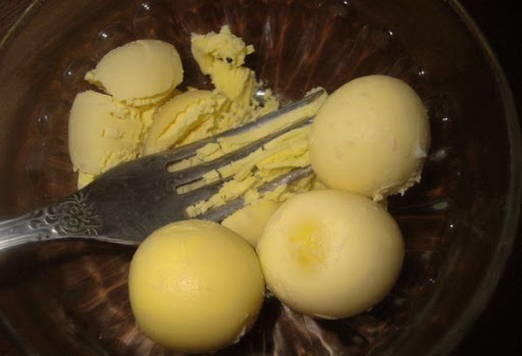 - Pureer de dooiers en voeg ze toe aan de massa.