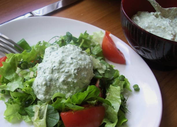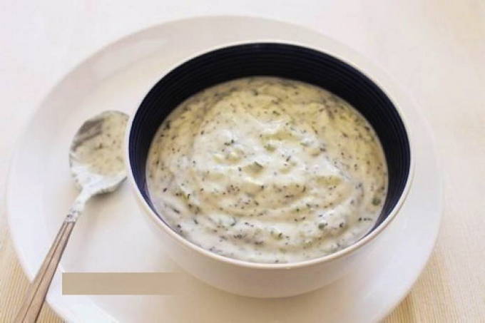 Een ongebruikelijk recept voor degenen die zich houden aan de principes van goede voeding of een dieet zonder koolhydraten. Kwark en kefir vullen de saus met maximale bruikbaarheid, en in plaats van verse rauwe dooiers worden gekookte gebruikt.