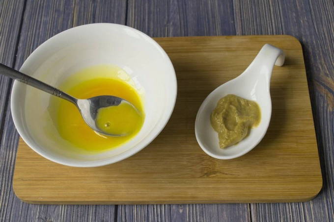 - Klop in een kom een vers ei los met de juiste hoeveelheid mosterd.
