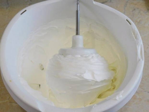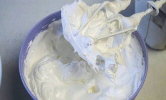 Laten we in de tussentijd verder gaan met het bereiden van de vulling. Voeg hiervoor mascarpone toe aan de goed opgeklopte room en meng goed met een spatel tot een massa uniform van consistentie is. Vergeet niet na 20 minuten te controleren of de meringue klaar is.