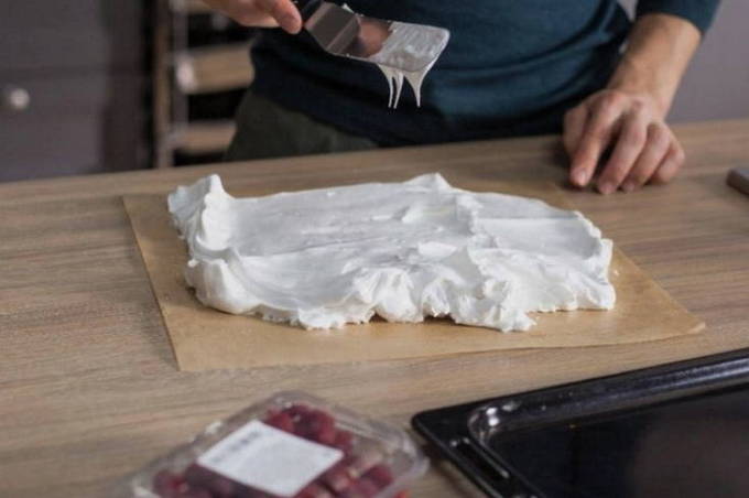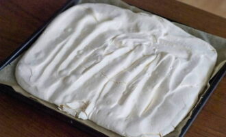 - Verdeel de homogene eiwitbasis over het oppervlak van de bakplaat, eerder bedekt met een vel goed perkament, en laat het 30 minuten bakken.
