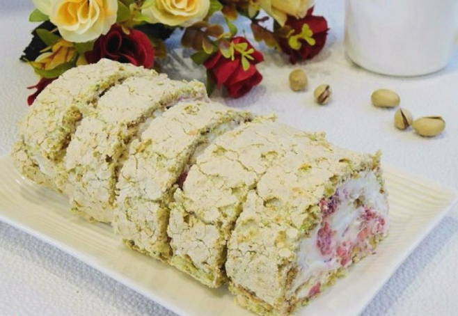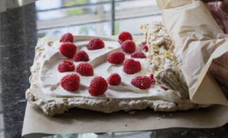 Hoe maak je een meringue roll met frambozen en pistachenoten?