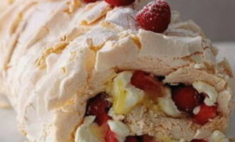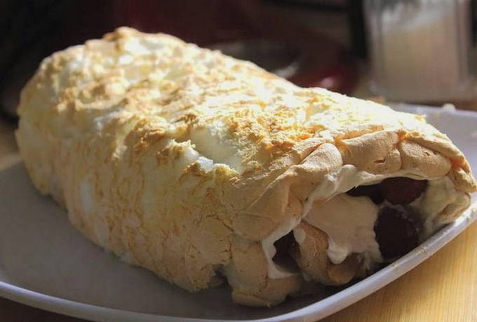 - Na deze tijd wisten alle componenten te grijpen en één geheel te worden. Snijd de meringuerol voor het opdienen met een scherp mes doormidden en serveer.