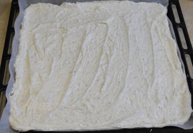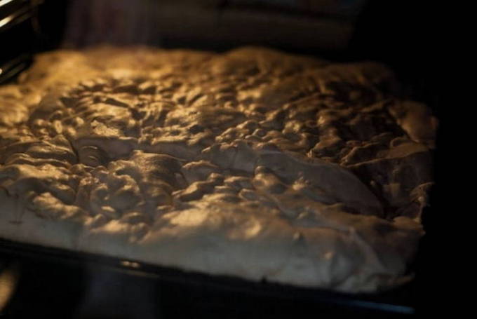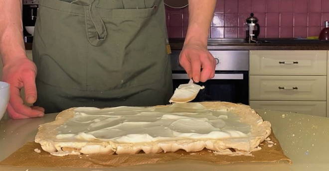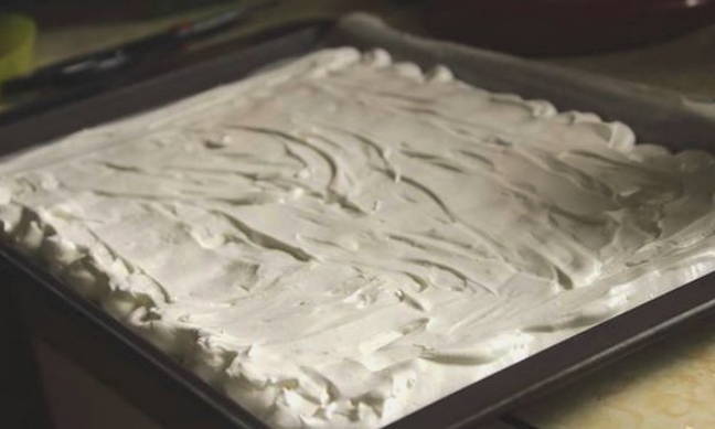 - Bedek de bakplaat met bakpapier en vul met een weelderige eiwitmassa. Daarna bakken we 25 minuten in een op 180 graden voorverwarmde oven.
