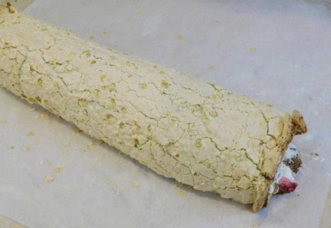 - In dit stadium rollen we de meringue op tot een buis, vormen een longitudinale rol en laten deze een uur in de koelkast staan.