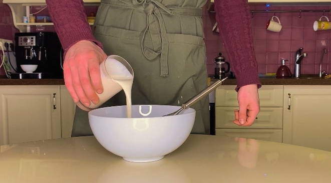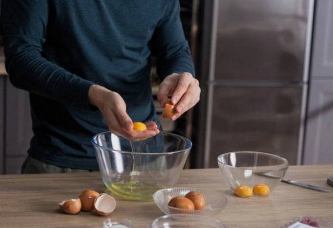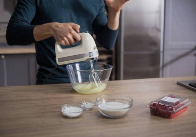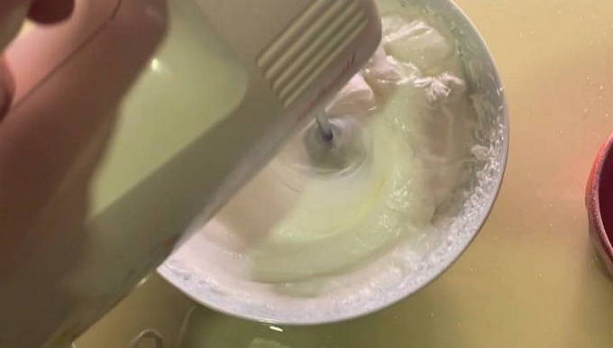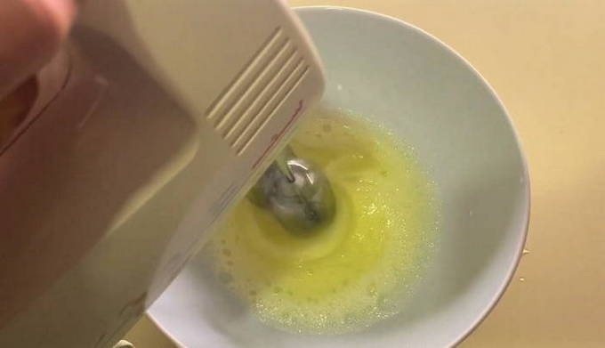 - Allereerst scheiden we het wit van de dooiers en kloppen we met een mixer op lage snelheid, waarbij we de snelheid geleidelijk verhogen.