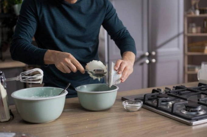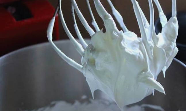 - Klop de eiwitten apart tot ze luchtig en stevig zijn. Daarna beginnen we langzaam azijn en bulkingrediënten als zetmeel en kristalsuiker te introduceren. We blijven kloppen met een mixer op lage snelheden totdat een donzige en glanzende massa is verkregen.
