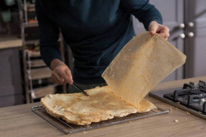 - Na deze tijd controleren we de gereedheid van de meringue en brengen deze over van de bakplaat naar het werkoppervlak. Laat de afgewerkte cake 15 minuten afkoelen op kamertemperatuur. Laten we in de tussentijd naar de volgende fase gaan.