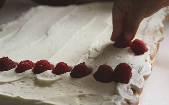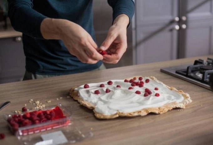- Bestrijk de afgekoelde meringuecake met royale botercrème en voorbereide frambozen.