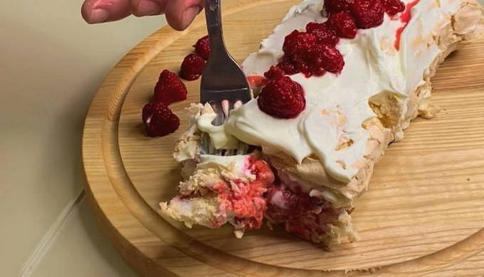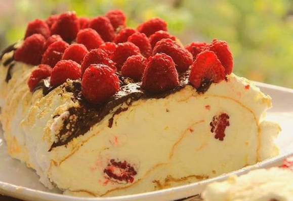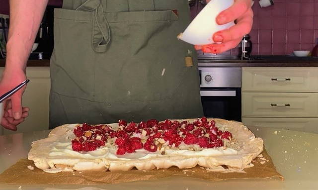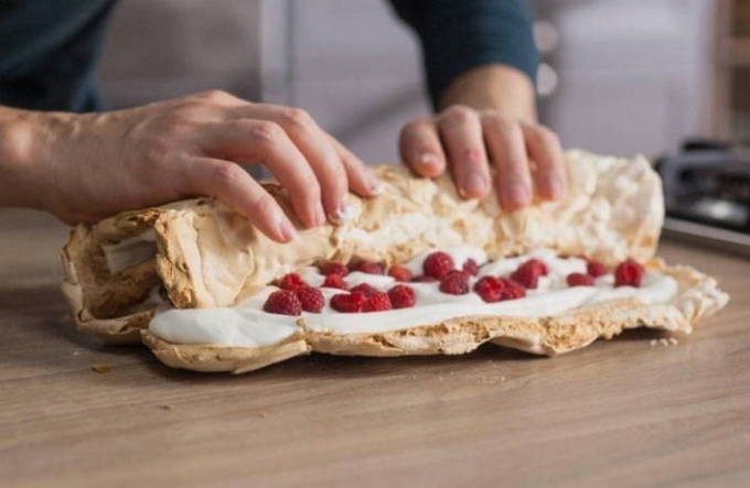 Nadat de meringue is afgekoeld, bestrijkt u deze met een laag crème en verdeelt u de frambozen. We laten een paar centimeter aan één rand vrij en beginnen de rol in te wikkelen. Tijdens het draaien zal de meringue een beetje breken, waar je niet bang voor hoeft te zijn.
