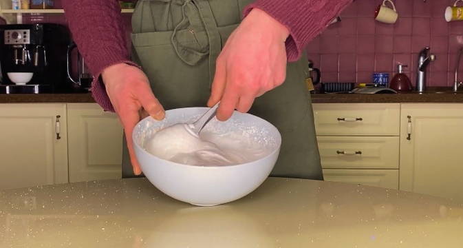 - Meng hier voorzichtig de maïzena door en probeer luchtbellen in de eiwitmassa te houden.