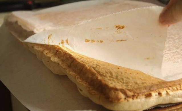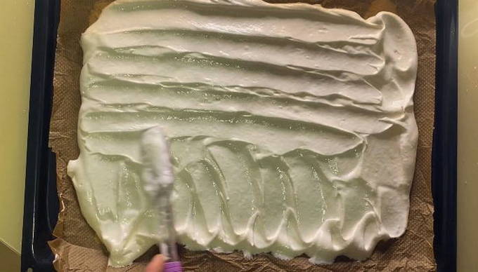 - Bedek een bakplaat met bakpapier en spreid de voorbereide massa uit, gelijkmatig over het oppervlak. Vervolgens sturen we de eiwitmassa om te worden gebakken in een oven die is voorverwarmd tot 180 graden.