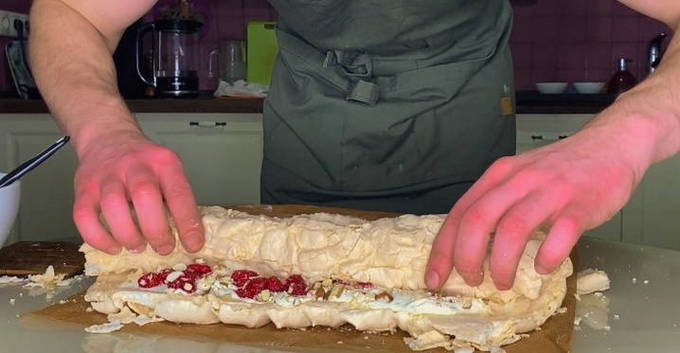 - Aan het einde gaan we verder met de vorming van de rol. Rol hiervoor de krokante meringue op, van de drogere rand naar de elastische. Bewaar de meringuerol voor het serveren 2-3 uur in de koelkast.