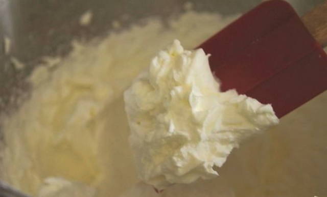 - Klop voor de room de gekoelde room en voeg geleidelijk de gezeefde poedersuiker toe. Verspreid vervolgens wat roomkaas en klop tot een gladde massa. We sturen de afgewerkte room naar de koelkast tot het volgende gebruik.
