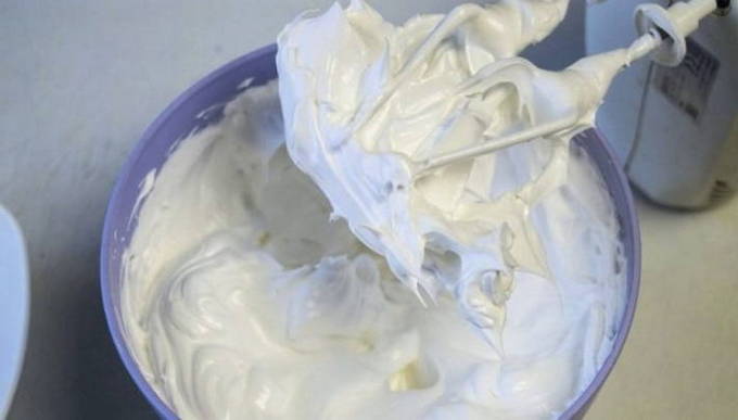 - Klop de eiwitten apart tot ze luchtig en stevig zijn. Daarna beginnen we langzaam azijn en bulkingrediënten als zetmeel en kristalsuiker te introduceren. We blijven kloppen met een mixer op lage snelheden totdat een donzige en glanzende massa is verkregen.