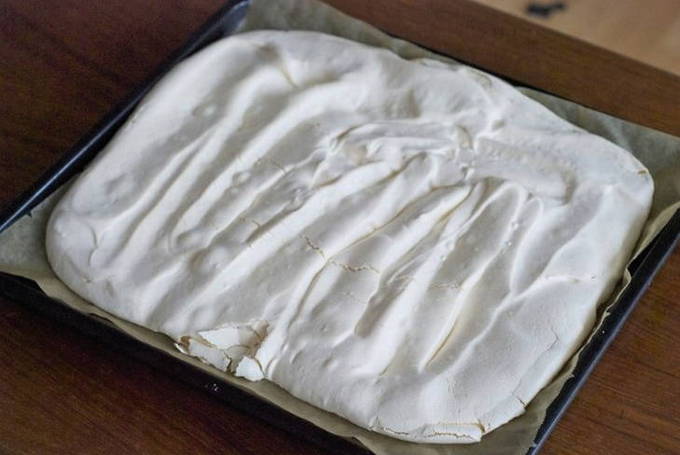 - Na deze tijd controleren we de gereedheid van de meringue en brengen deze over van de bakplaat naar het werkoppervlak. Laat de afgewerkte cake 15 minuten afkoelen op kamertemperatuur. Laten we in de tussentijd naar de volgende fase gaan.