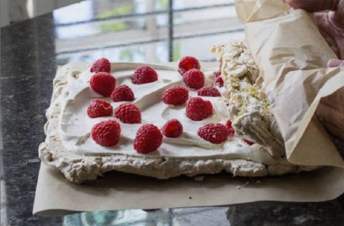 Nadat de meringue is afgekoeld, bestrijkt u deze met een laag crème en verdeelt u de frambozen. We laten een paar centimeter aan één rand vrij en beginnen de rol in te wikkelen. Tijdens het draaien zal de meringue een beetje breken, waar je niet bang voor hoeft te zijn.