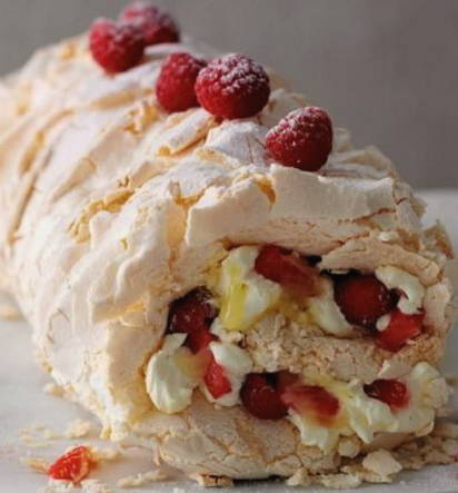 - Na deze tijd wisten alle componenten te grijpen en één geheel te worden. Snijd de meringuerol voor het opdienen met een scherp mes doormidden en serveer.