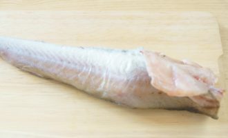 - Verwerk karkassen van koolvis op de traditionele manier: snij de vinnen, staarten af en was buiten en binnen zodat er geen sporen van ingewanden en schubben zijn. Snijd de vis vervolgens in porties.