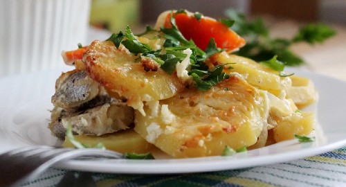 - Smeer de bovenkant van de blanco in met mayonaise of teken een mayonaisegaas.Stuur de vis en aardappelen 40 minuten naar de oven. De baktemperatuur is 180 graden. Als de aardappelen te vroeg bruin worden, dek de vorm dan af met folie en verwijder deze 15 minuten voor het koken. Het gebeurt, integendeel, er is niet genoeg goudbruin korstje op de aardappelen. Dan kun je er een beetje geraspte kaas op strooien of extra invetten met mayonaise of zure room.