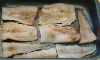 Kruid de filet in porties met peper en zout. Leg de vis in een voorbereide vorm met hoge zijkanten. Het moet in één laag worden gelegd.