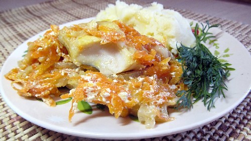 - Koolvis gebakken met uien en wortelen met mayonaise