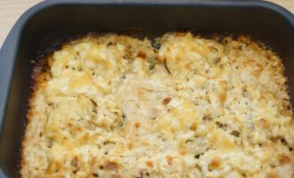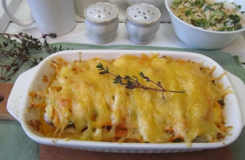 - Leg de helft van de gefrituurde groentemassa op de bodem van de vorm, egaliseer deze. Leg vervolgens de stukken of filets van vis, leg ze ook plat. Bovenop ligt weer een laag van de overige groenten.